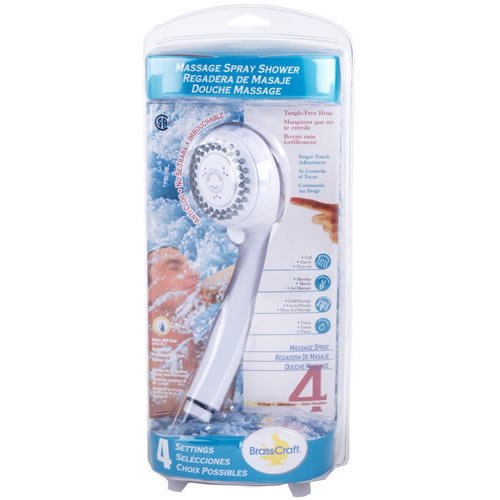 Contemporary styling. Anti-clog rubber tips for easy cleaning. Tangle free hose design. Four selection settings include full spray, massage spray, combination full massage spray and pause control. Meets ANSI A112.18.1 M standard of 2.5 GPM max flow rate. Includes 60" hose and mounting bracket.