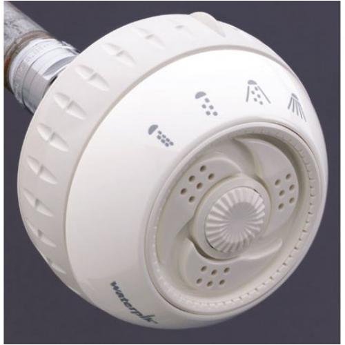 White, Shower Massager, Fixed Mount, 6 Spray/Massage Settings, 124 Spray Channels For Complete Body Coverage, Rubber Control Ring, 5 Year Warranty, Made In The USA.