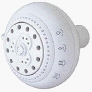 Contemporary styling. Anti-clog rubber tips for easy cleaning. Four selection settings including full spray, aerated spray, massage spray and pause control. Meets ANSI A112.18.1 M standard of 2.5 GPM max flow rate. Plastic body shower head with metal ball connector.