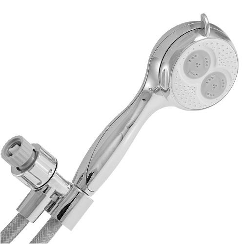 WaterPik DML-653CG dual massage hand-held showerhead with 6 spray/massage settings. Grey with chrome accents. Dual Massage's Revolutionary Technology provides a shower experience like no other. Side by side pulsating massage action provides greater massage coverage than ever before featuring 2X the massage, 2X the coverage. Six spray settings: Fast Dual Massaging Pulse, Slow Dual Massaging Pulse, Full Body Sprays, Center Sprays, Combo: Full Body Sprays/Center Sprays, Water Saving Sprays. All the functionality of 2 showerheads wrapped into one - requires less space and provides better performance. Easy-grip mode ring clicks into place when changing modes. Installs in minutes.