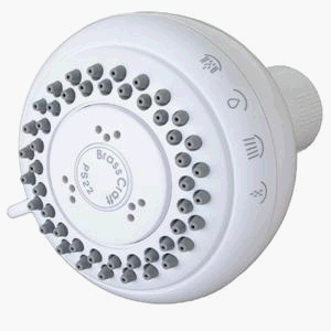 Contemporary styling. Anti-clog rubber tips for easy cleaning. Four selection settings include full spray, massage spray, combination full/massage spray and pause control. Meets ANSI A112.18.1 M standard of 2.5 GPM max flow rate. Plastic body shower head with metal ball connector.
